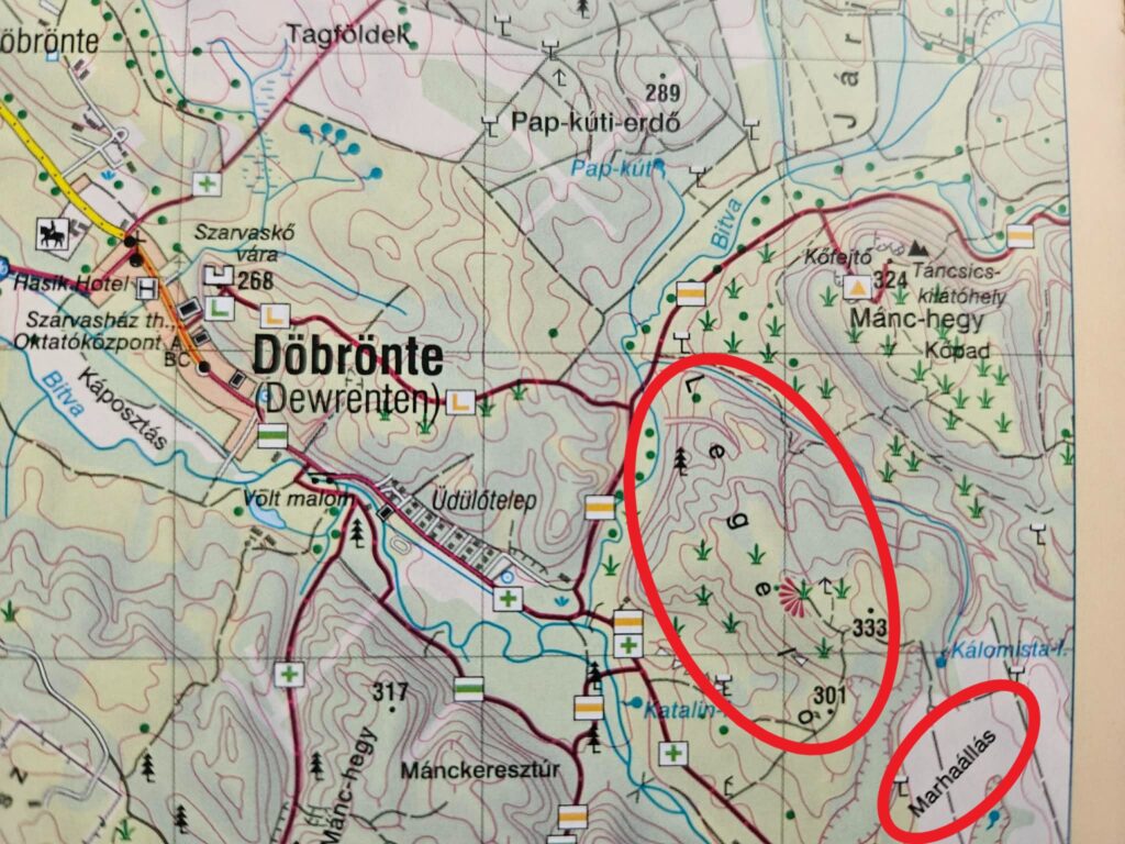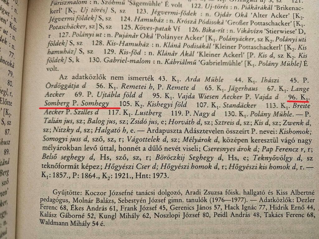 - Földrajzi nevek. Említésre kerül a fent idézett szövegben a Somhegy, mely ezek szerint a patak vízgyűjtő területén kell legyen, és valahol Döbrönte közelében kell keresni. „Álljunk meg egy szóra”, hiszen a Som-hegy, Somló elnevezések egyik térképi névi értelmezése a Földrajzi nevek etimológiai szótára (1978.) szerint: „a zöld erdőövezetből kiemelkedő kopasz, sziklás hegytető”. Ilyen jellegű területből a morfológiánál írottak alapján van bőven a környéken, a bökkenő csak az, hogy sem a régi, sem a mai térképek, sem a helyi öregek nem ismernek ilyen nevű hegyet a közelben. Termesztésen a kutatást ki kell terjesztenünk a szomszédos Bakonyjákó, Magyarpolány és Ganna területére is, mert Döbröntével együtt ezek a települések adják a patak vízgyűjtő területét. A megoldást Bakonyjákó község határának Döbrönte felé eső része adja, ahová Veszprém megye földrajzi neveinek a Pápai járásra vonatkozó II. kötete (1987.), az adatközlők által egyébként nem ismert, Somberg, Somhegy elnevezést közli. Az eredeti leíró a forrásmegjelölés (P.) alapján Pesty Frigyes, aki 1888-ban jelentette meg Magyarország helynevei történeti, földrajzi és nyelvészeti tekintetben c. munkáját. A jelzett hely (96) egybeesik a morfológiai fejezetben írott, fátlan platóval.